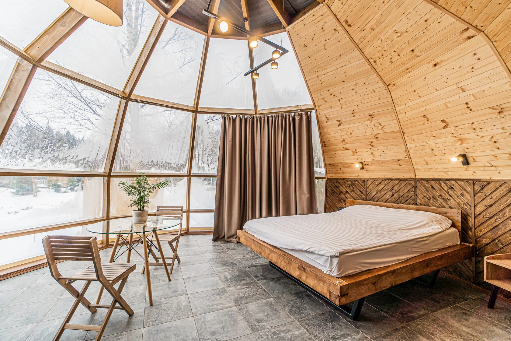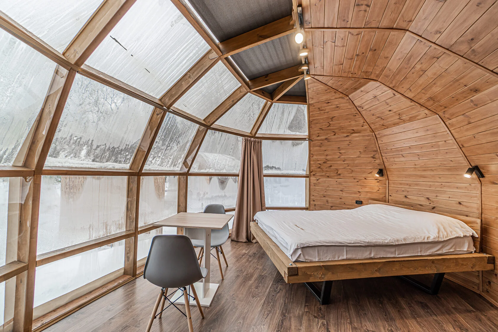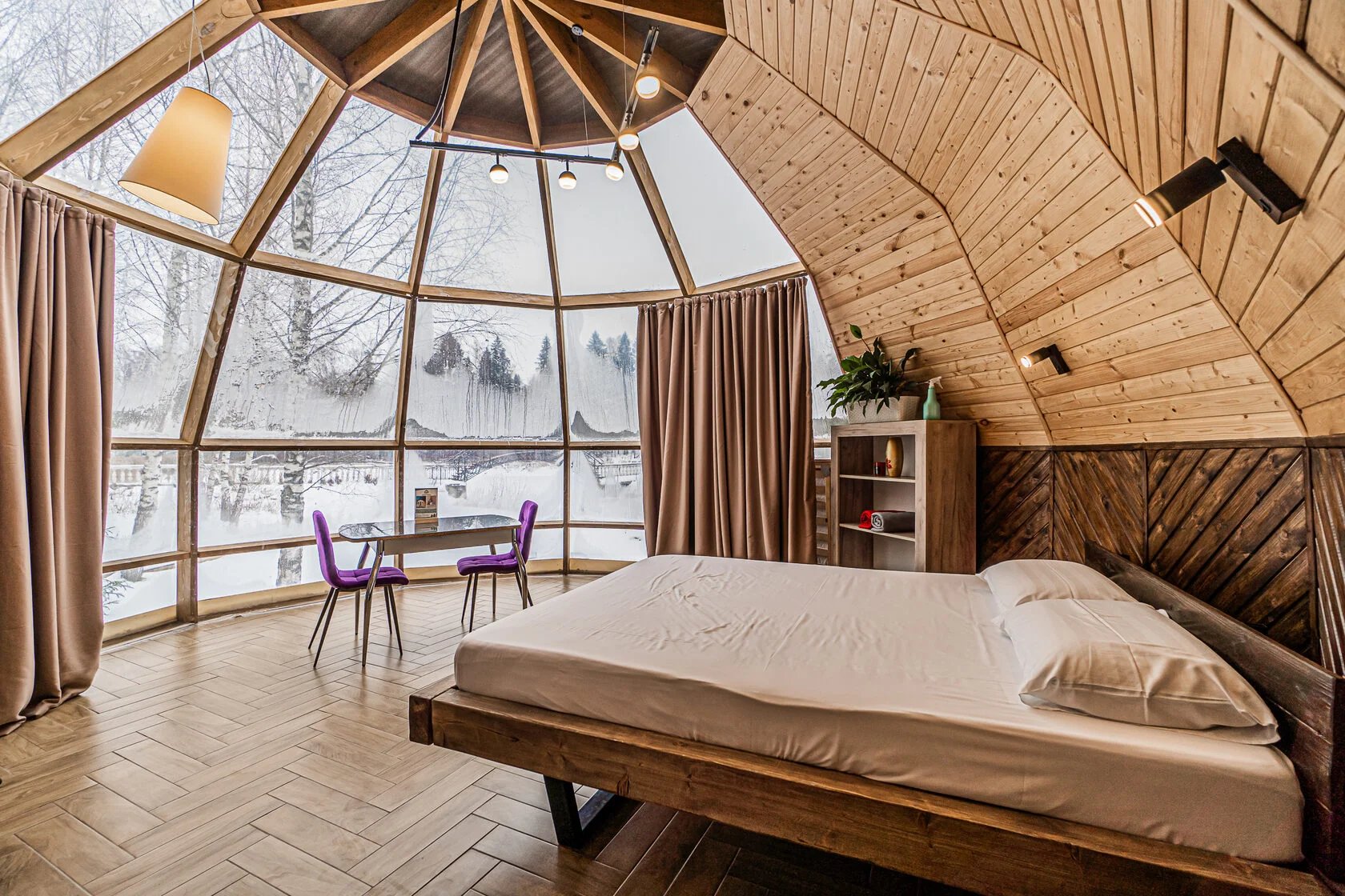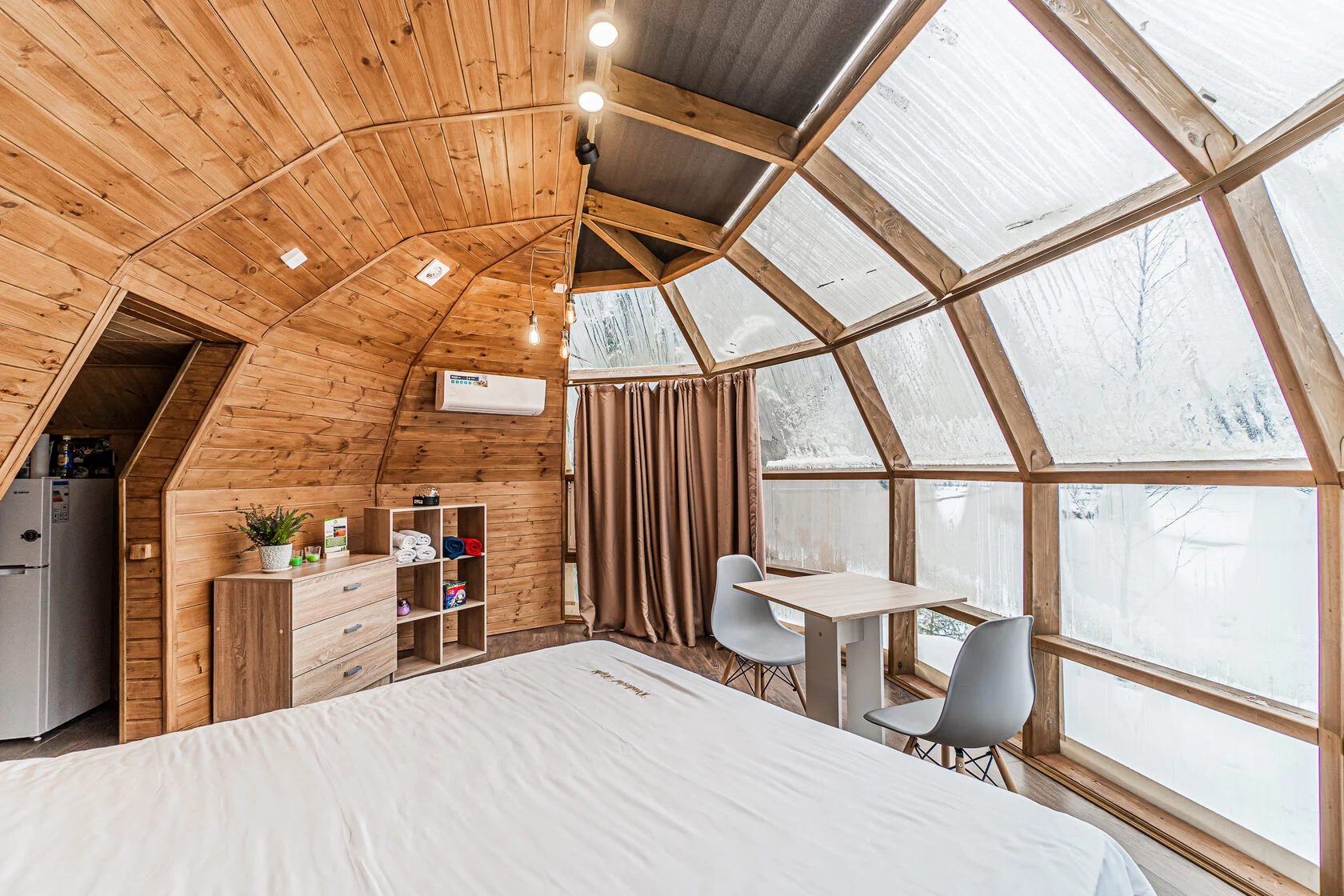 Глэмпинг 4 сезона – это максимум комфорта: дизайнерское оформление, сан. узел с горячей водой, теплые полы, собственная кухня и гриль зона. За крепкий сон отвечают анатомические матрасы. Для проживания доступны 3 типа геокуполов, от маленького уютного номера для пары, до большого двухэтажного купола на 6 человек.
