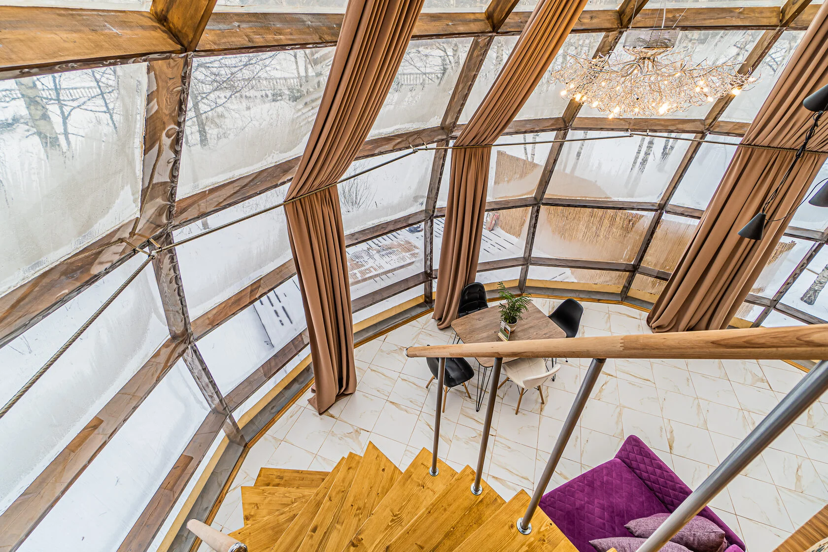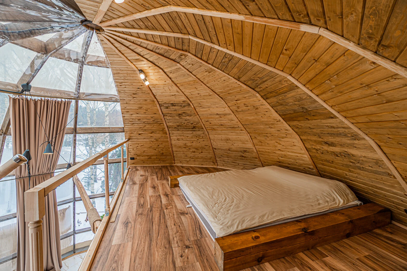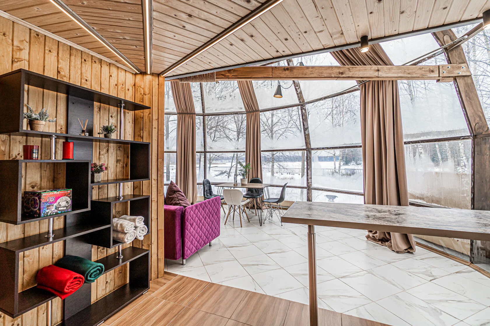 Глэмпинг 4 сезона – это максимум комфорта: дизайнерское оформление, сан. узел с горячей водой, теплые полы, собственная кухня и гриль зона. За крепкий сон отвечают анатомические матрасы. Для проживания доступны 3 типа геокуполов, от маленького уютного номера для пары, до большого двухэтажного купола на 6 человек.