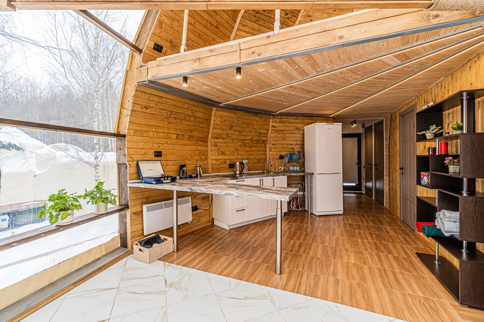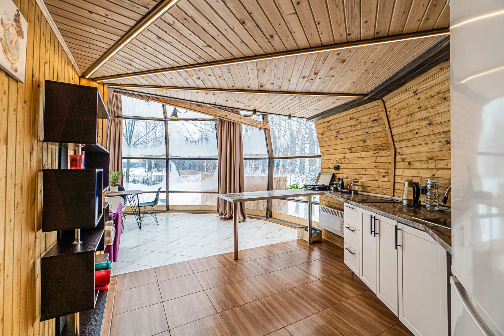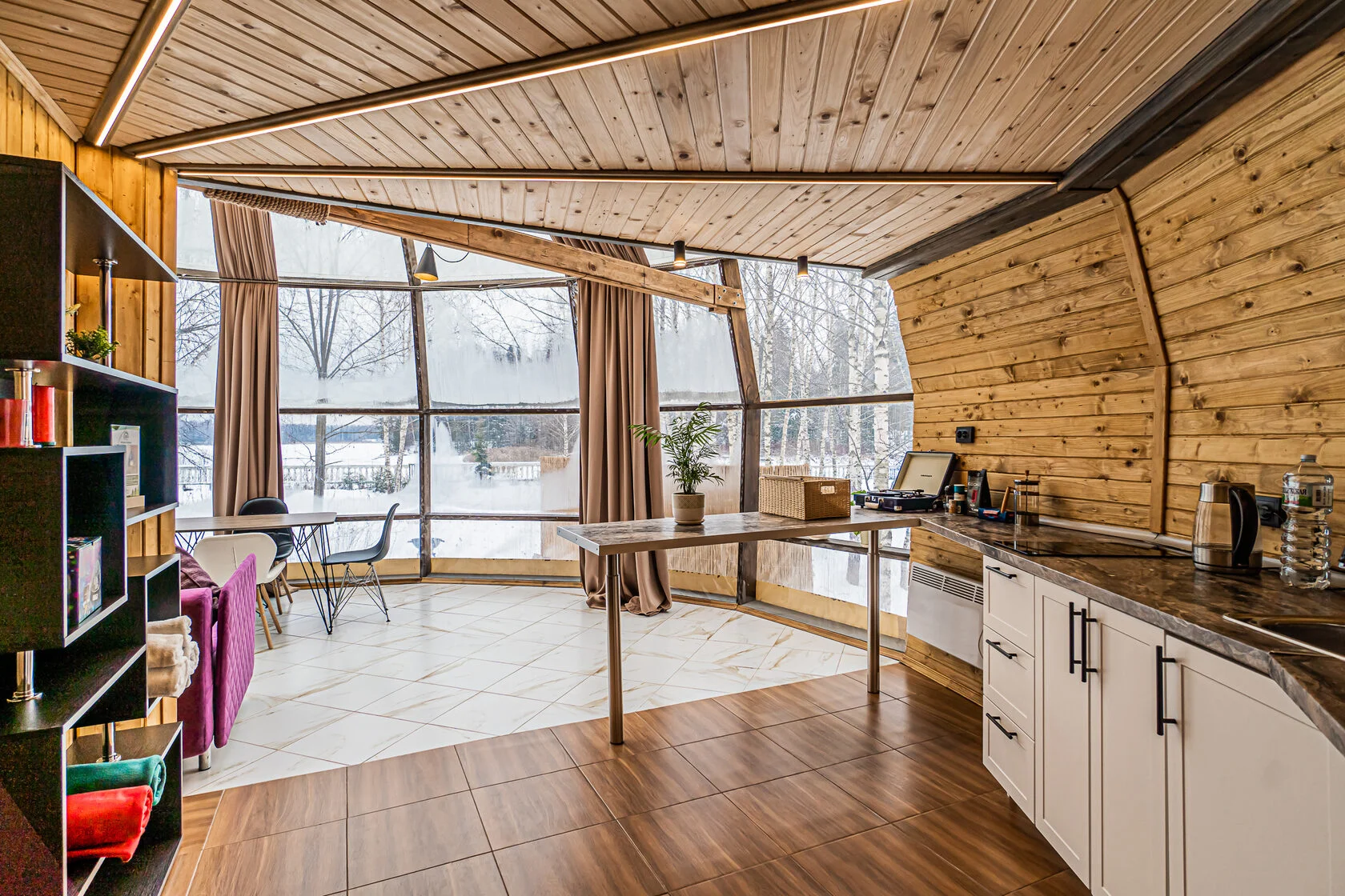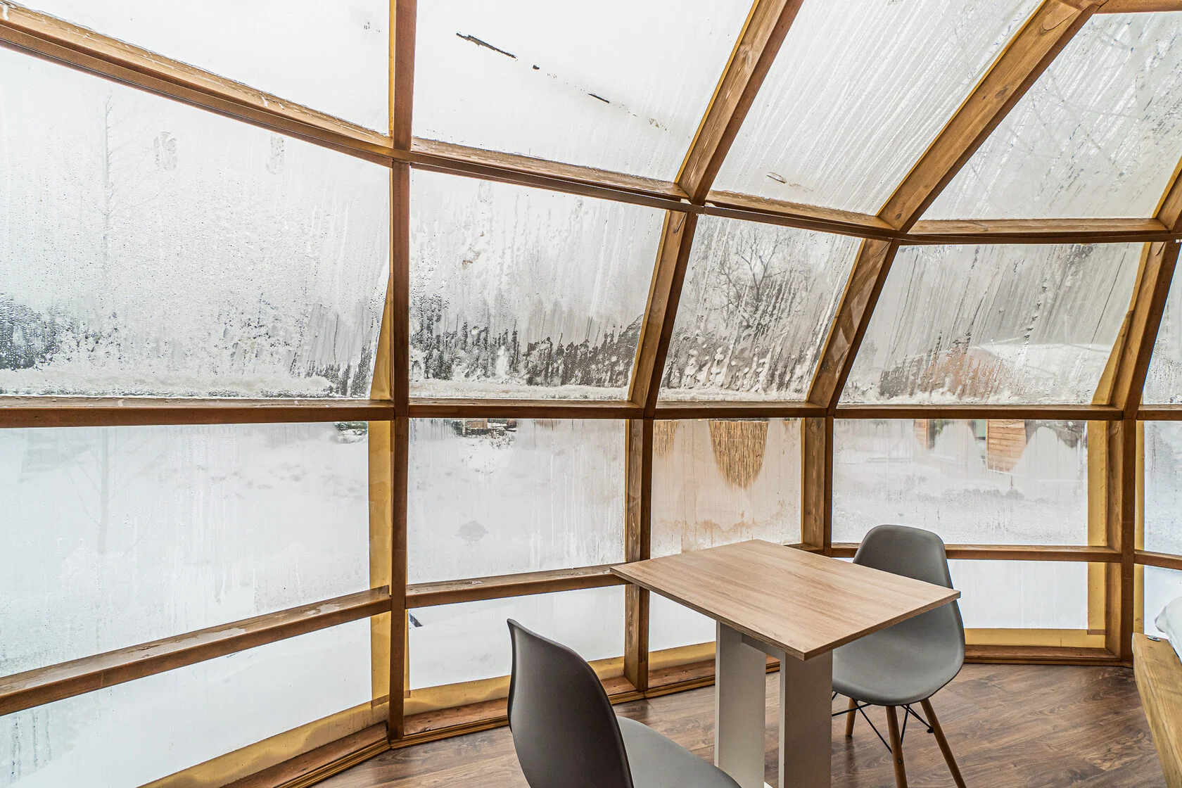 Глэмпинг 4 сезона – это максимум комфорта: дизайнерское оформление, сан. узел с горячей водой, теплые полы, собственная кухня и гриль зона. За крепкий сон отвечают анатомические матрасы. Для проживания доступны 3 типа геокуполов, от маленького уютного номера для пары, до большого двухэтажного купола на 6 человек.