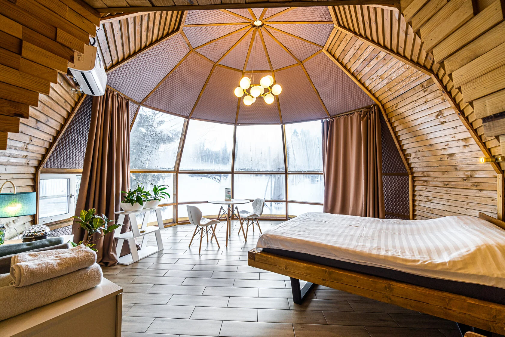 Номера сделаны в виде Геокуполов с панорамным остеклением. Ночное звездное небо и вдохновляющие рассветы помогут восстановиться и набраться сил. Прекрасный вид на воду — в каждом номере!