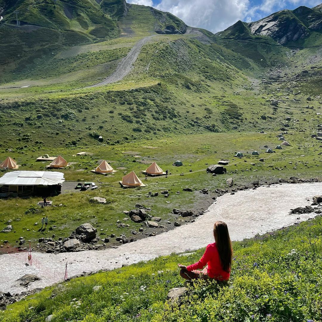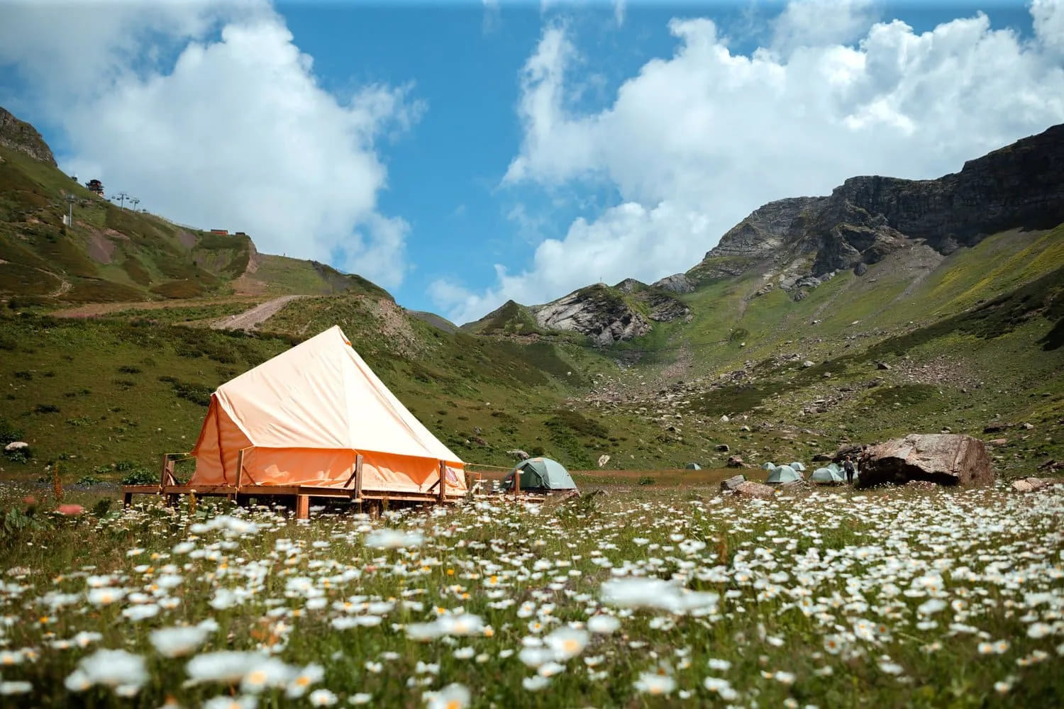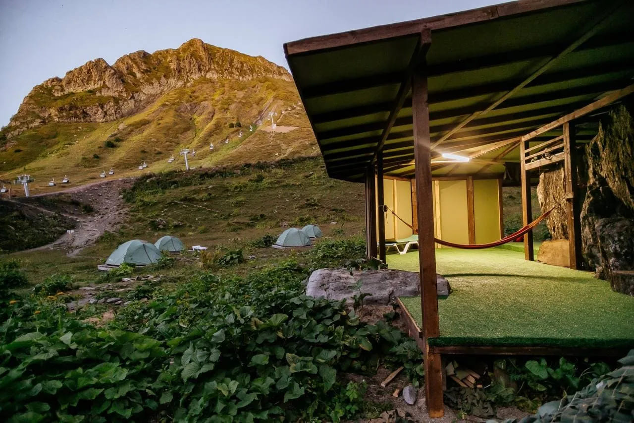 Проживание в палатках глэмпинга позволит окунуться в атмосферу настоящей горной природы, увидеть Кавказские горы в дымке закатов и рассветов, а также отправиться на прогулку по экотропам еще до начала работы канатных дорог.