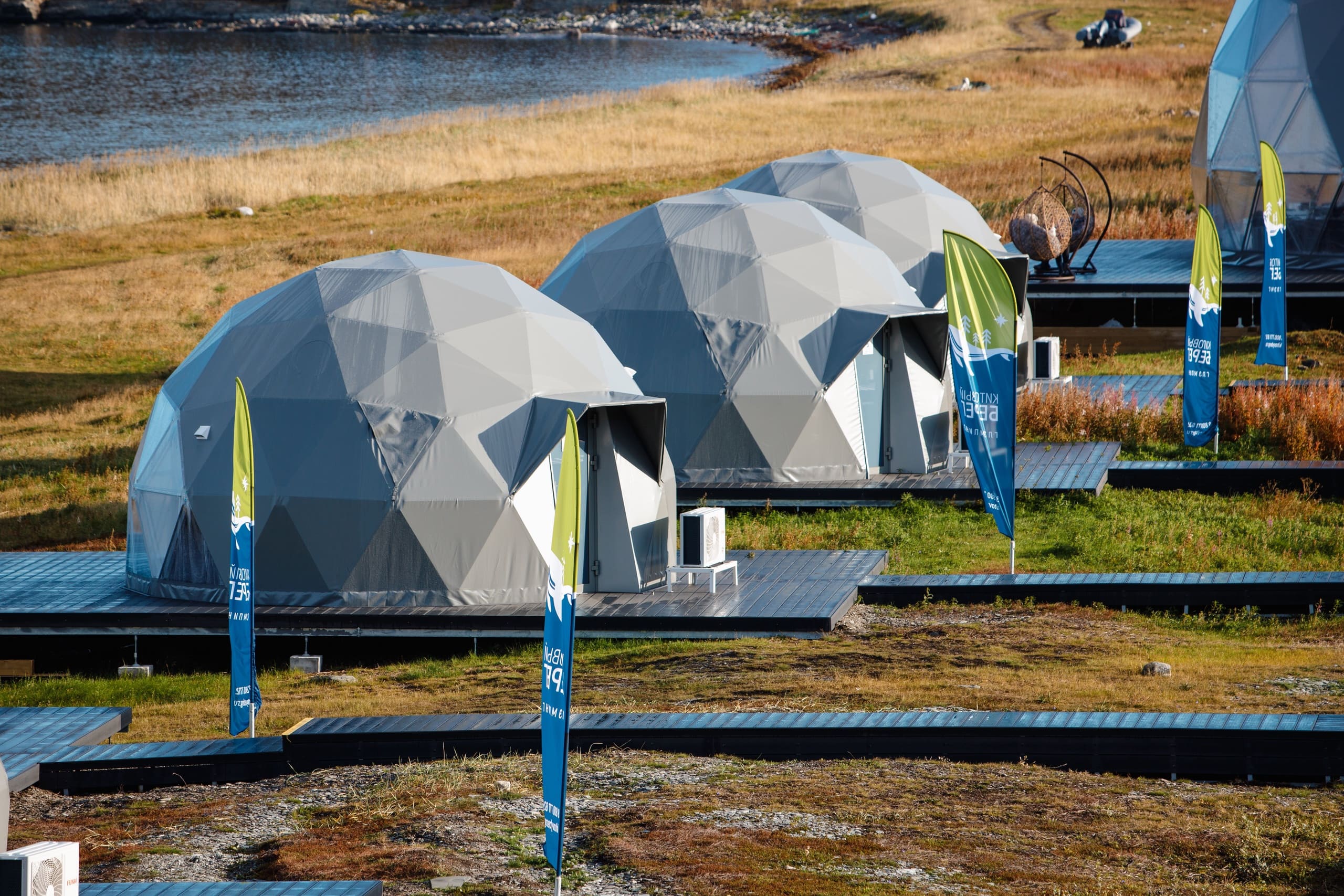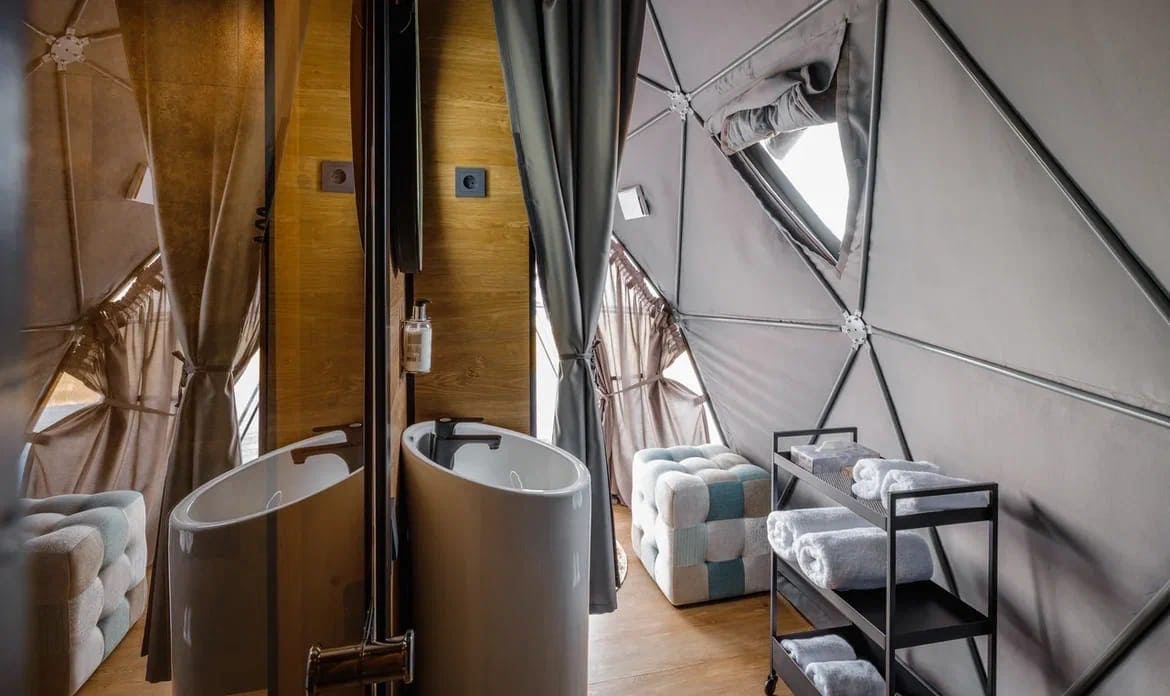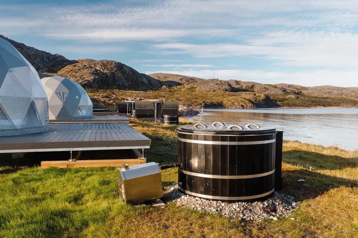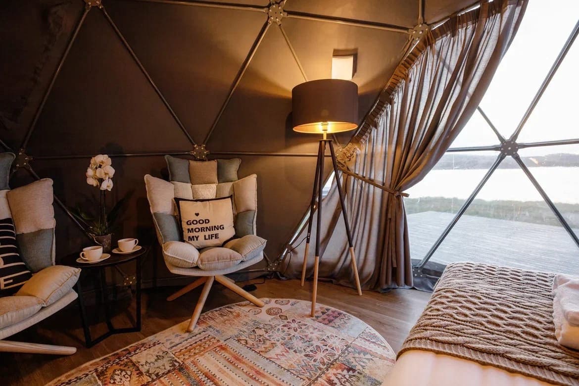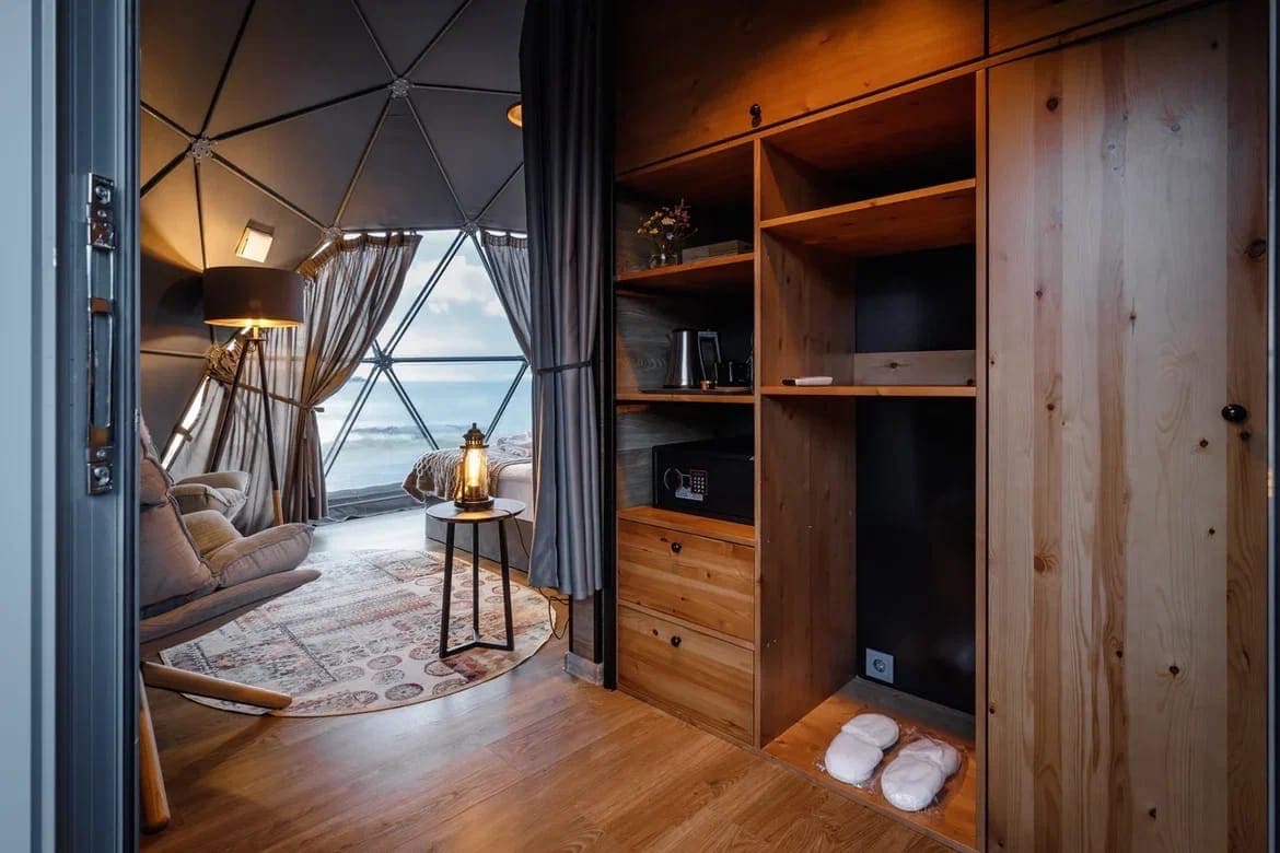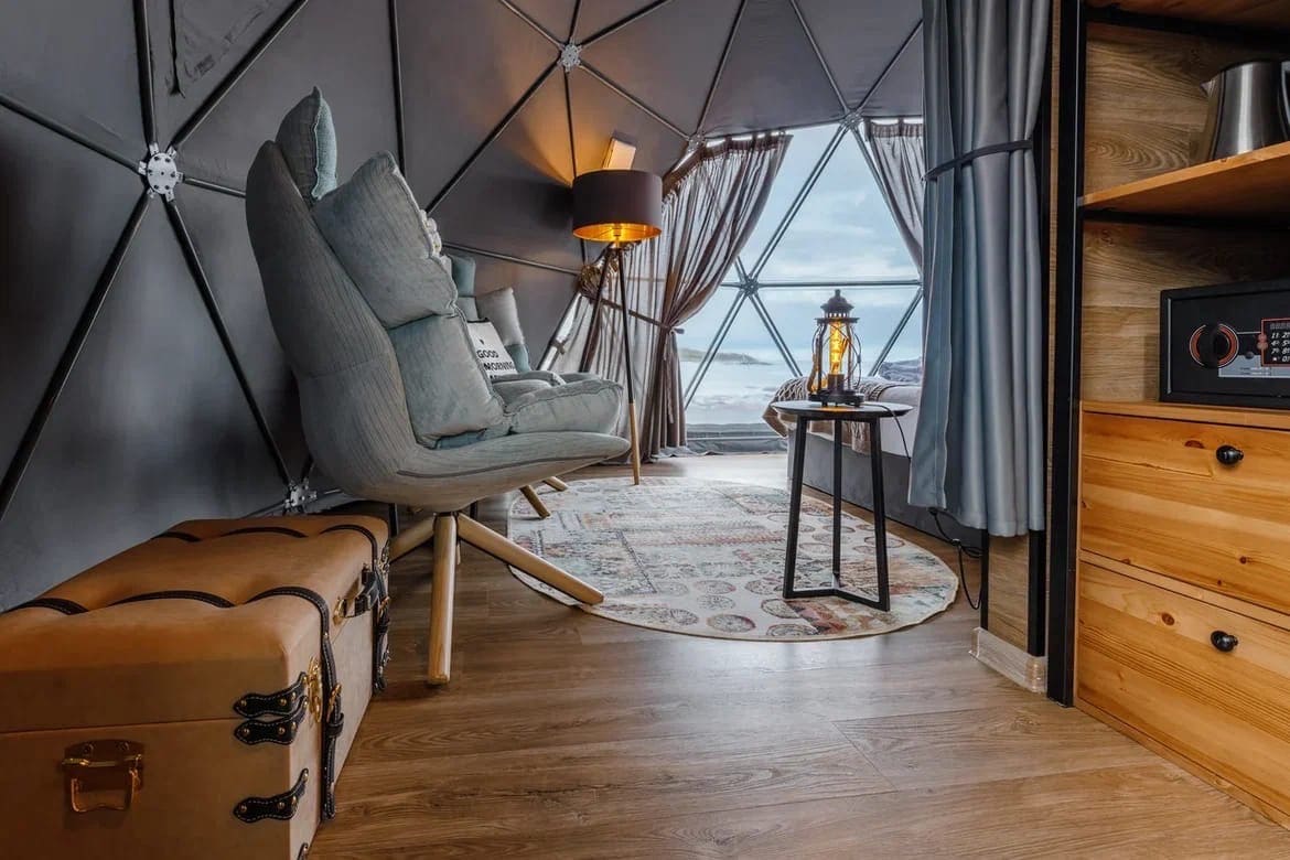 Глэмпинг Китовый берег состоит из 15 купольных шатров. Удобная кровать, дизайнерская мебель и зона отдыха. Каждая экосфера — как комфортабельный номер в отеле. Из панорамного окна видно Баренцево море и иногда – северное сияние.
