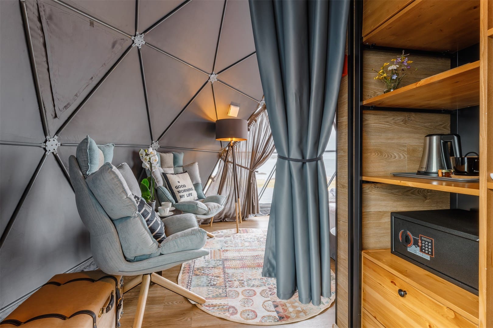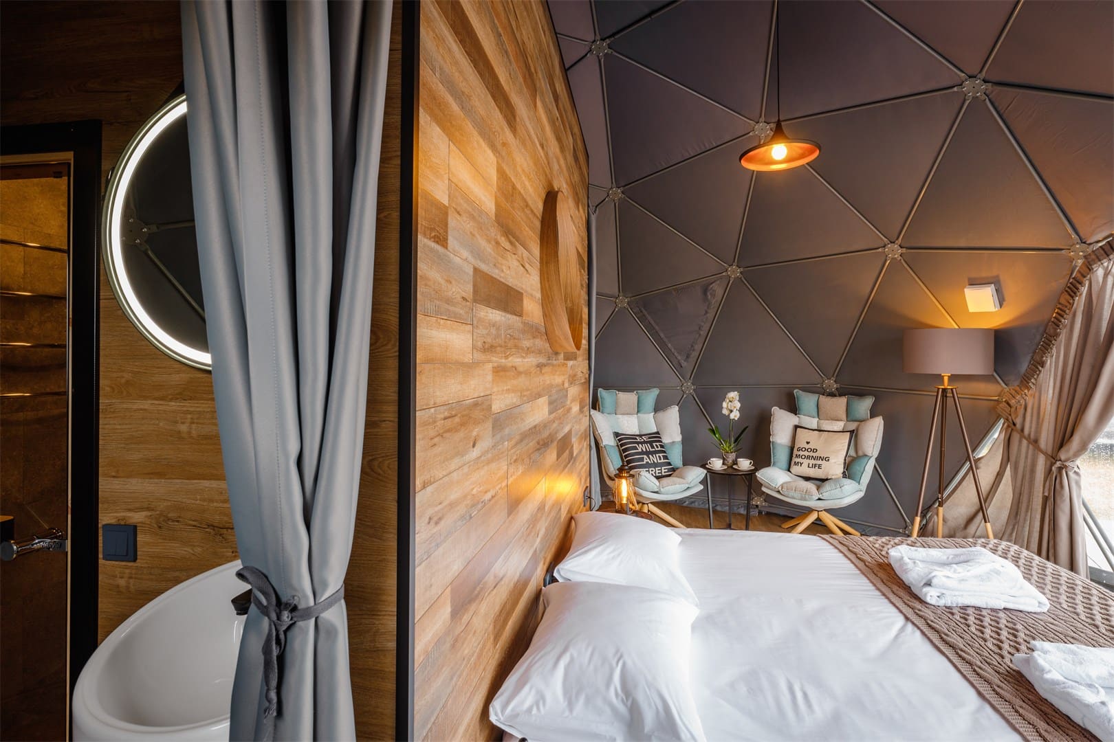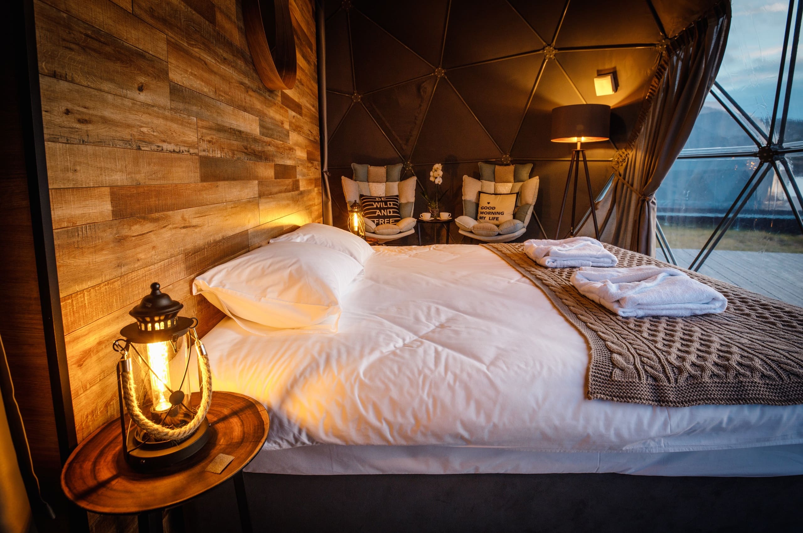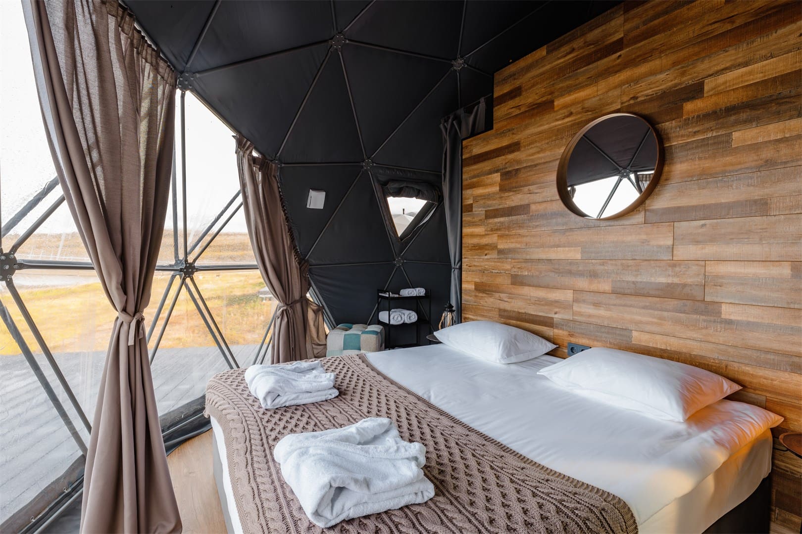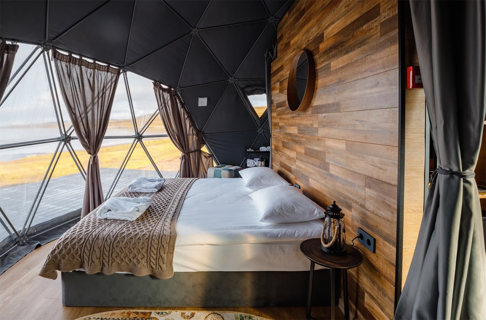 Глэмпинг Китовый берег состоит из 15 купольных шатров. Удобная кровать, дизайнерская мебель и зона отдыха. Каждая экосфера — как комфортабельный номер в отеле. Из панорамного окна видно Баренцево море и иногда – северное сияние.