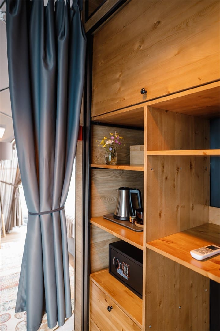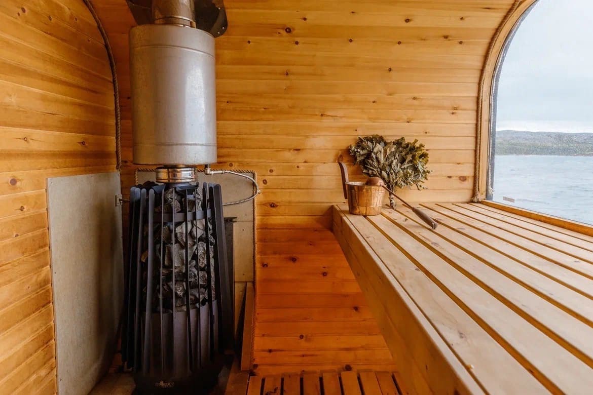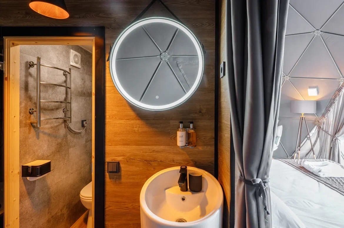 16-й купол — самый просторный. Его называют глэмпцентром: он совмещает функции ресторана и лобби. Здесь вам подадут оленину, камчатских крабов, пойманную вами рыбу и не только. Из ресторана хорошо смотреть на северное сияние, слушая треск дров в камине. На территории базы отдыха есть шикарный банный комплекс – две кедровые бани и шесть бочек фурако.