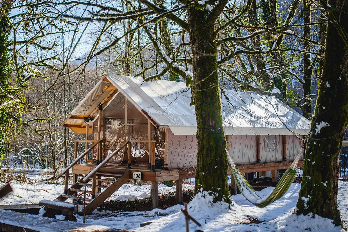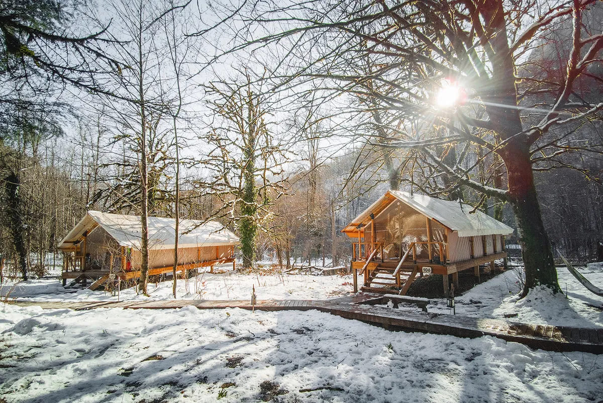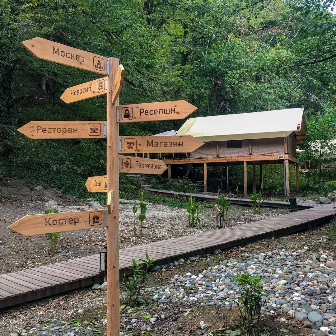 Находится глэмпинг и спа Лес на территории Сочинского Национального парка, в трёх километрах от села Чвижепсе. Всего 30 минут от Адлера и Красной поляны и вы окажетесь в другой реальности. В реальности, где наслаждаться природой можно в любое время года. В шатрах тёплые полы, кондиционеры, подогреваемые простыни и камин — как приправа к уютной атмосфере.