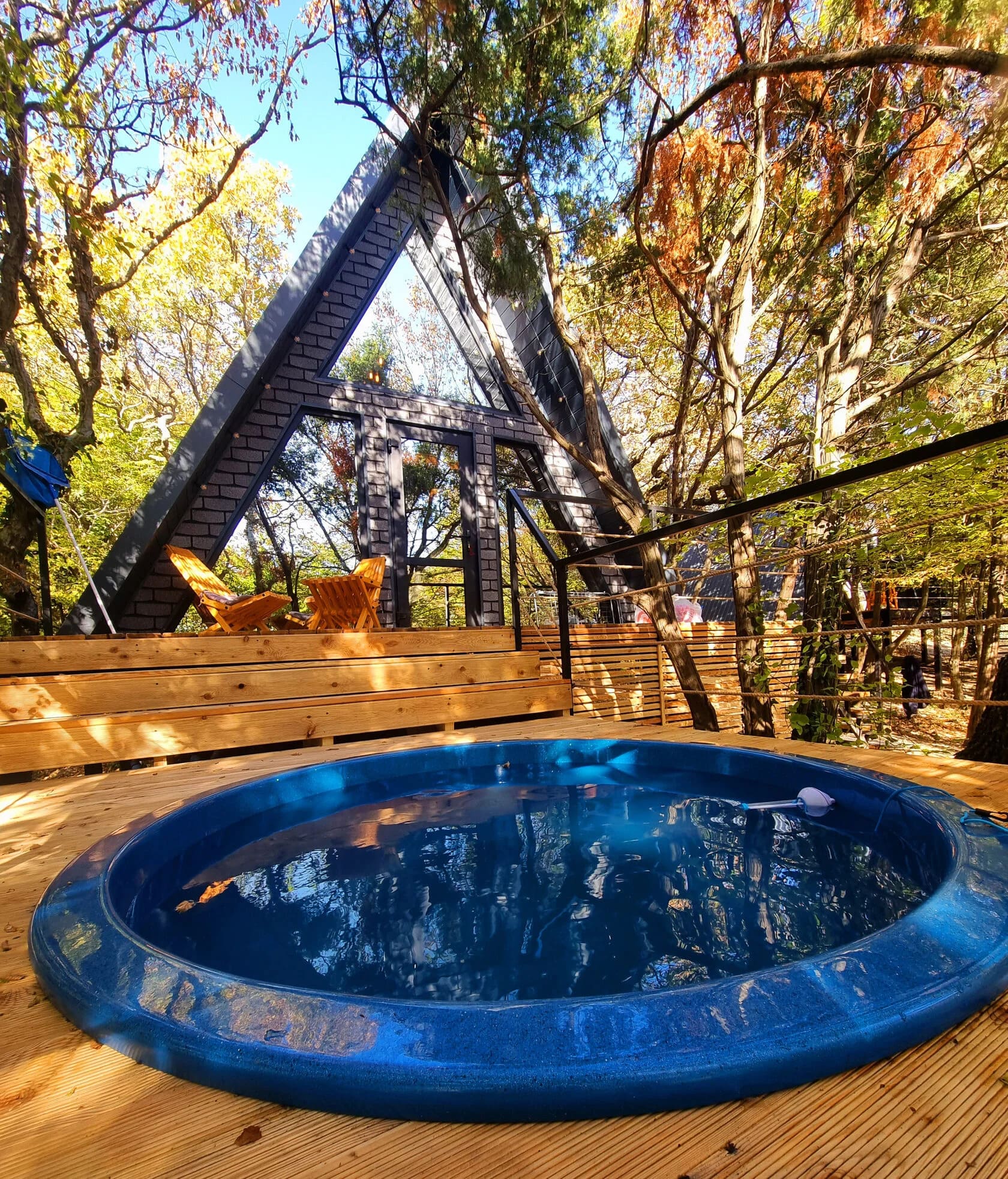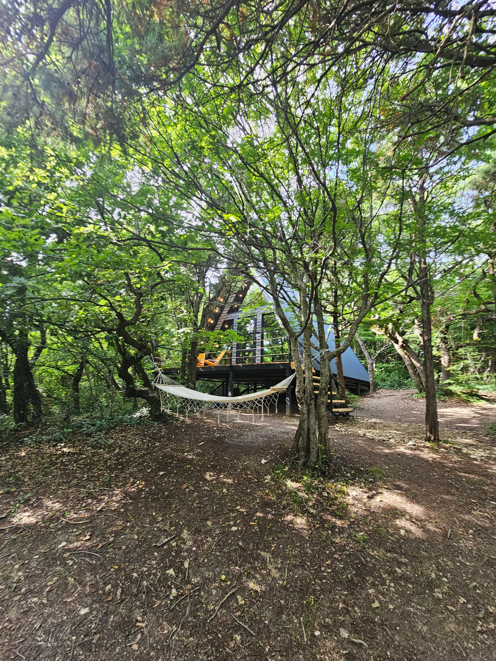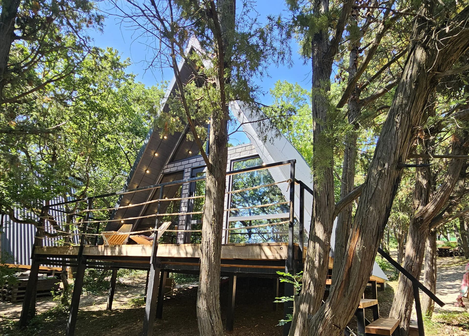 Чтобы не нарушать приватность отдыхающих глэмпинга, хозяева сделали отдельный спуск к морю от каждого а-фрейма. Особую атмосферу вечеров в глэмпинге Очаг создает уютная костровая зона для песен под гитару и душевных разговоров.