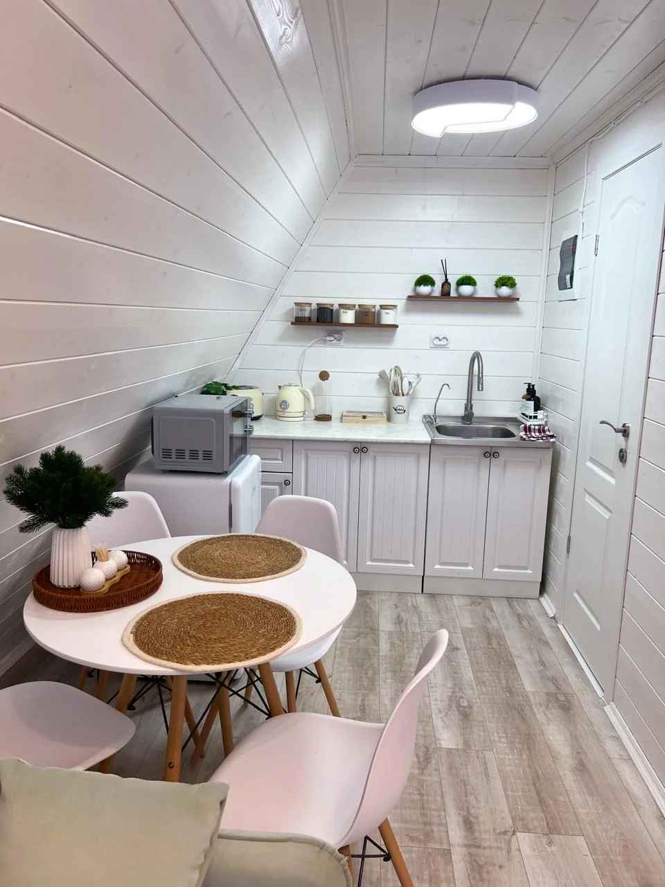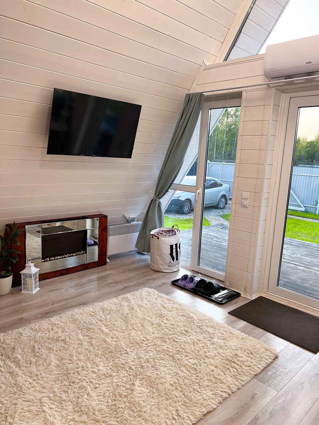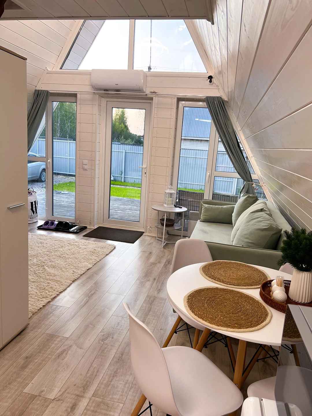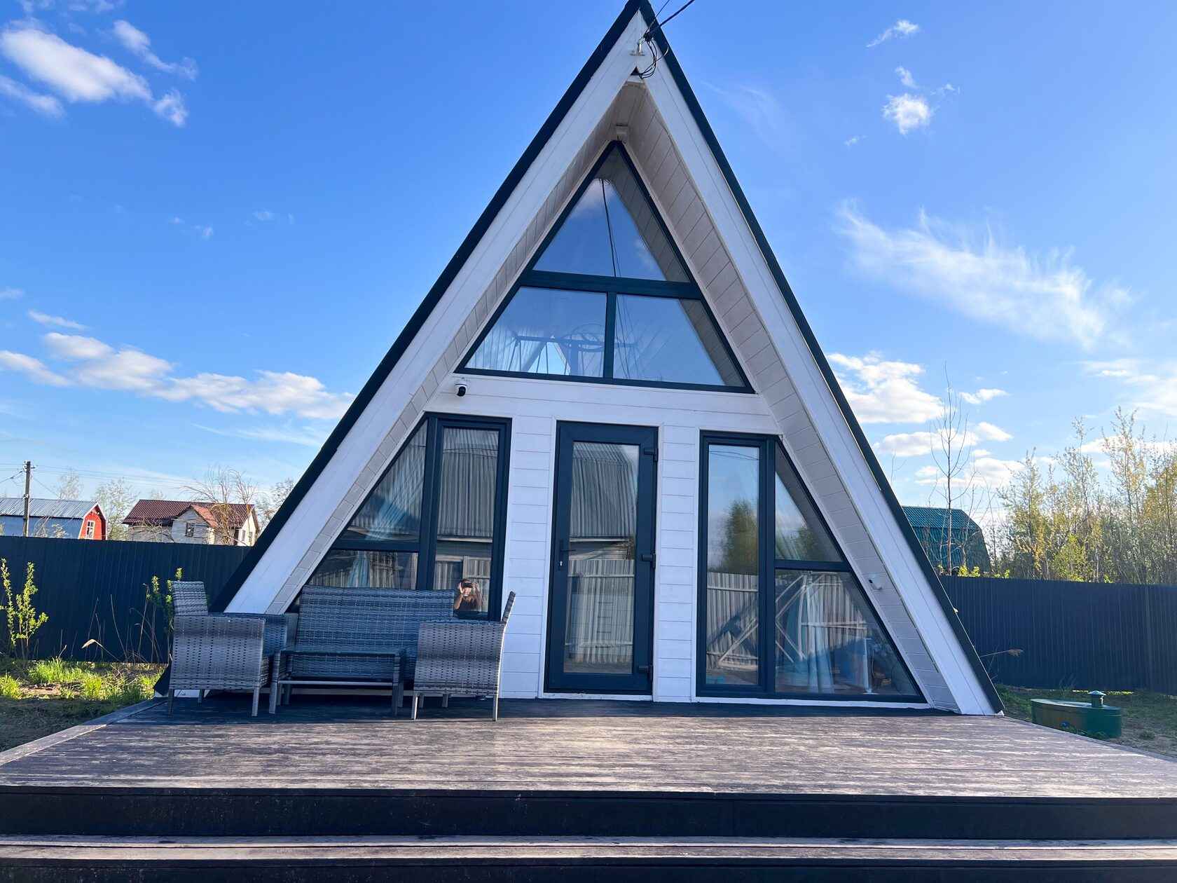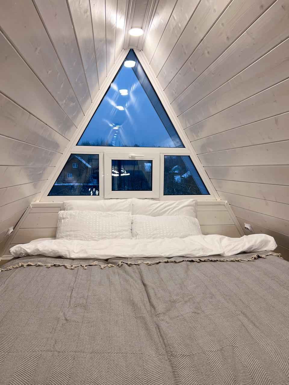 Shale Aframe – это компактный треугольный дом формата A-frame в Богородском городском округе Московской области на территории СНТ Заря, расположенный на ухоженном небольшом участке в окружении природы и тишины. Домик находится в поселке имени Воровского примерно в 30 километрах от МКАД по Носовихинскому шоссе, рядом есть несколько магазинов для покупки продуктов, работает доставка. Для проживания в глэмпинге Shale Aframe доступен двухэтажный дом площадью 45 квадратных метров с кроватью 200х200 с ортопедическим матрасом, раскладным диваном, умной колонкой Алиса, проигрывателем виниловых пластинок, электрическим камином, полностью оборудованной кухней с большим количеством посуды и столовых принадлежностей, а также настольными играми для досуга. На участке обустроена мангальная зона, установлен банный чан для парения на свежем воздухе вместимостью до четырех человек с топкой дровами и центральным столиком для напитков. Чан нагревается снизу вверх до комфортных 38-45 градусов и держит температуру более трех часов.