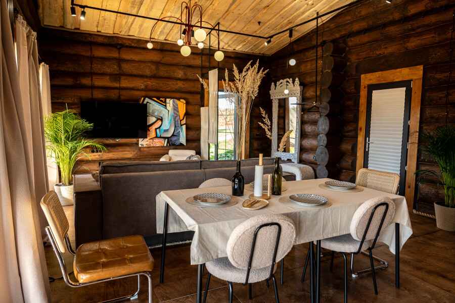 Вудхаус – это уютный глэмпинг, расположенный в деревне Лукино городского округа Истра, Московская область. Комплекс включает в себя коттеджи с дизайнерским интерьером, каждый из которых оснащен спальней с двуспальной кроватью, кухней-гостиной с дополнительными спальными местами, ванной комнатой и просторной террасой площадью 25 м². Для проживания в глэмпинге Вудхаус доступны два коттеджа: “Темный дом” и “Светлый дом”, каждый из которых рассчитан на размещение от 2 до 4 гостей. Для отдыха гостей предусмотрены собственная сауна, чан и подогреваемая купель на открытом воздухе. На территории обустроена мангальная зона для приготовления блюд на огне. Глэмпинг расположен на окраине поселка, рядом с лесом и берегом небольшой реки, создавая атмосферу уединения и гармонии с природой.