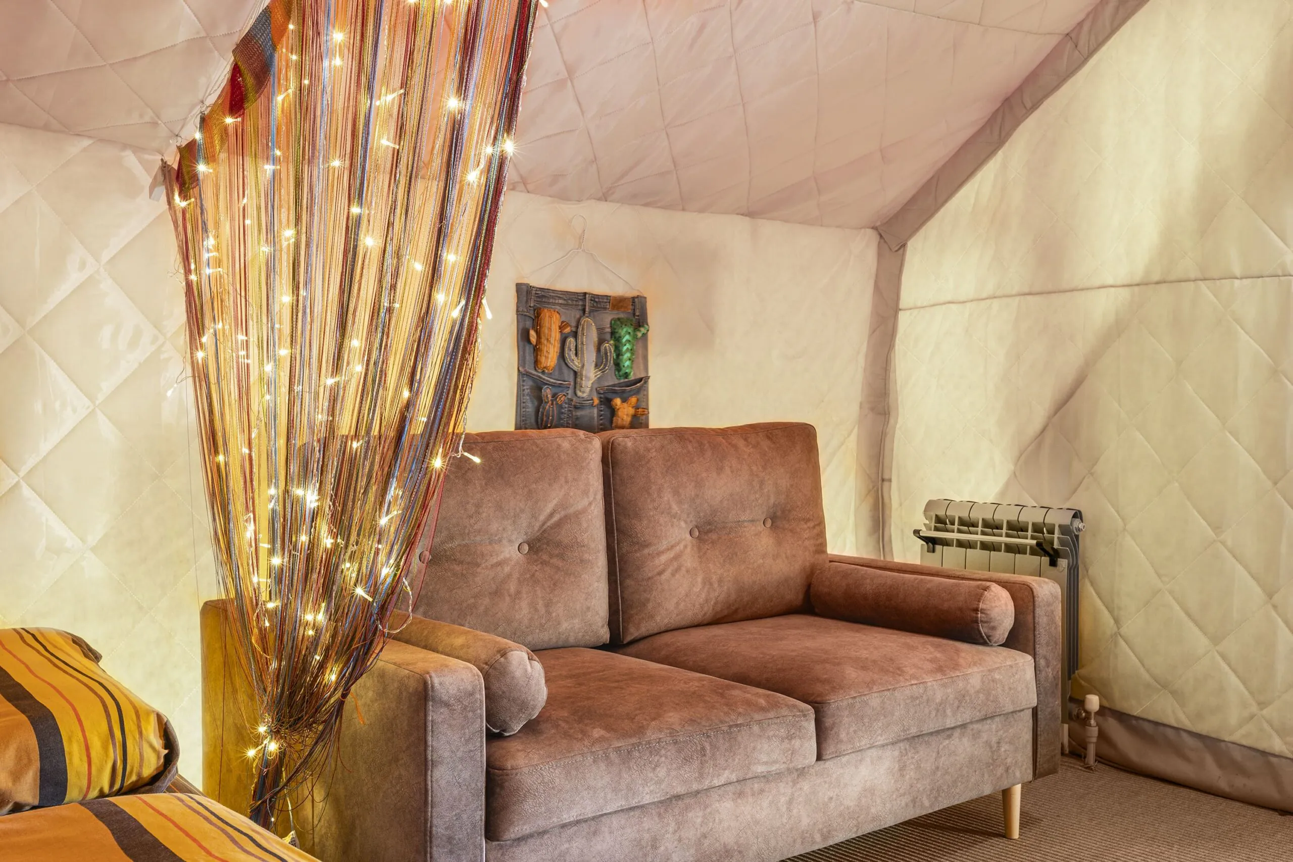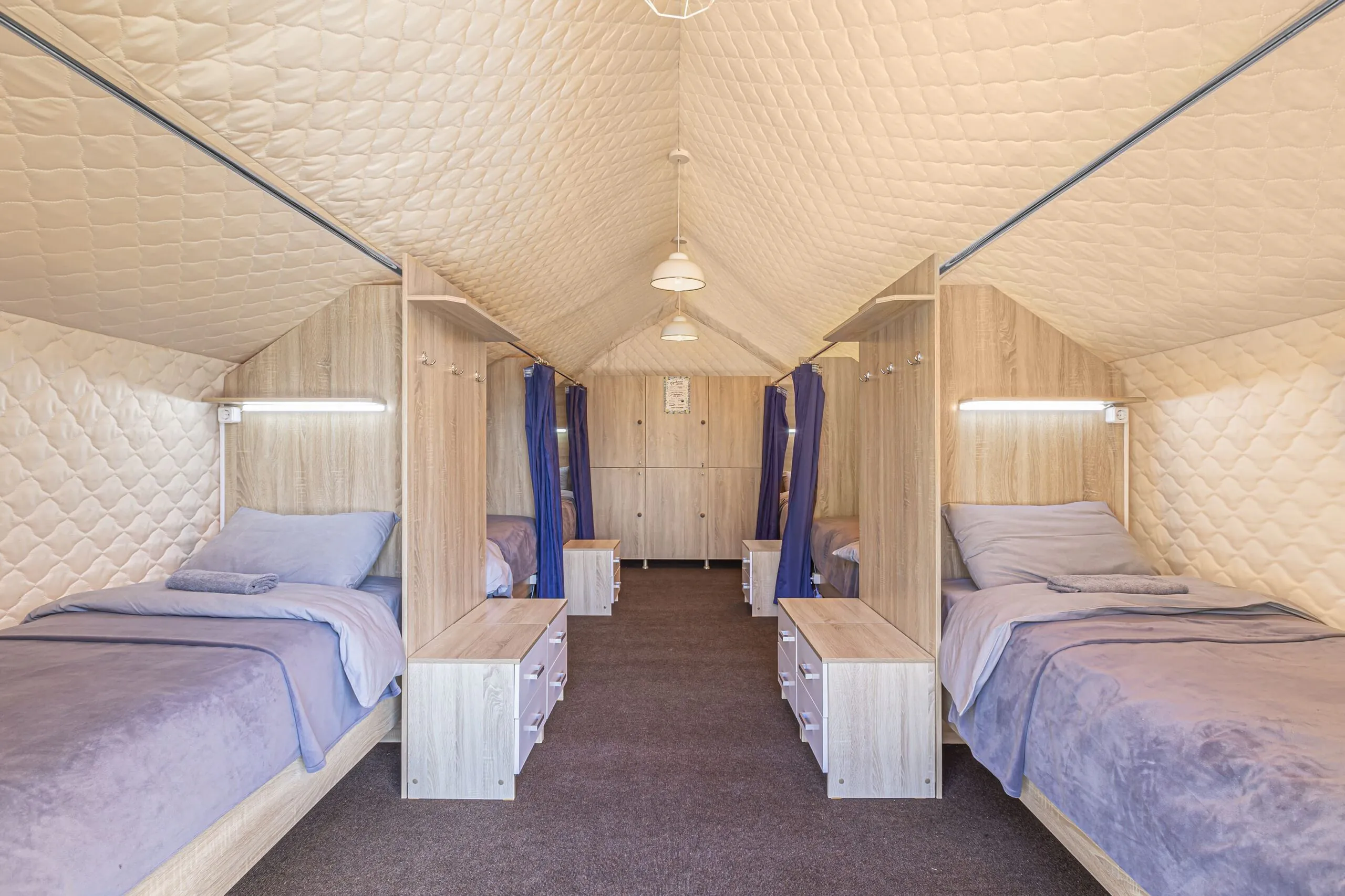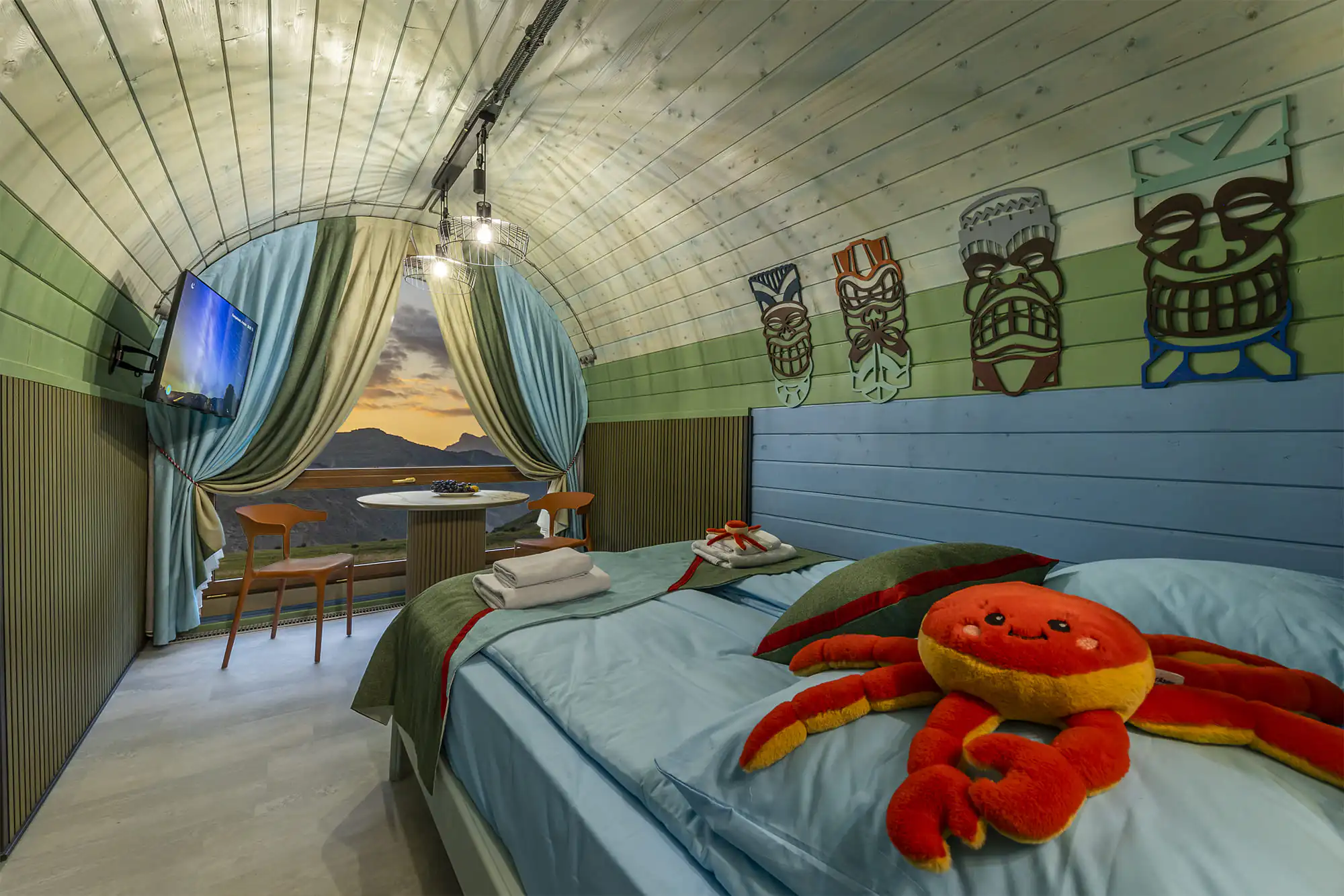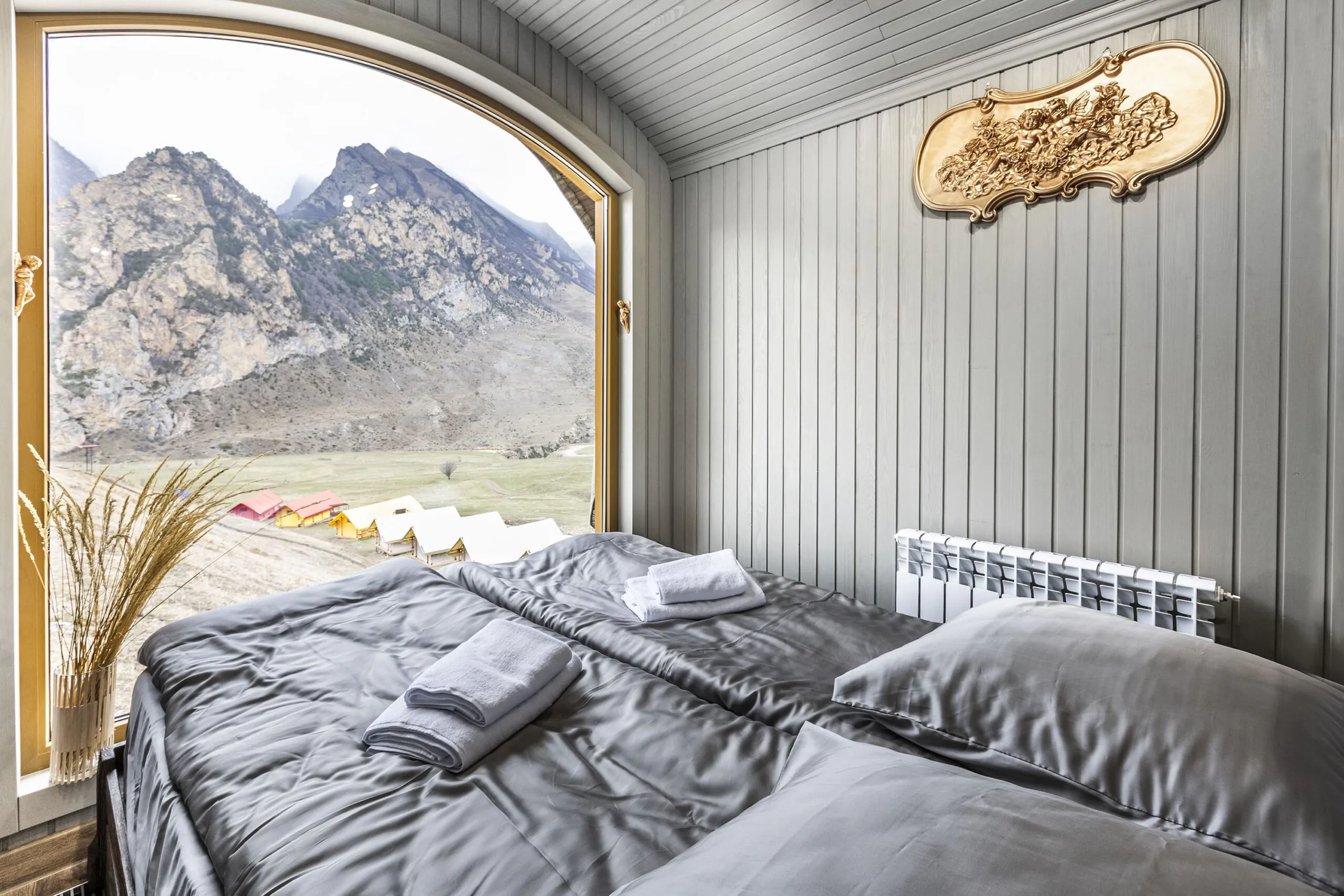 На территории глэмпинга размещены благоустроенные сафари-тенты, хаус-тенты и эксклюзивные бутик-номера с авторским дизайном, оборудованные всем необходимым для приятного проживания. Каждый домик оснащен удобными спальными местами, отоплением для комфортного пребывания в любое время года, а также панорамными окнами, через которые открываются захватывающие виды на горные пейзажи. Гости могут наслаждаться звездным небом прямо из своего номера.
